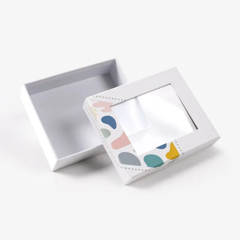 Die-cut shape is layered with plastic film to feature a window showcasing the product inside.